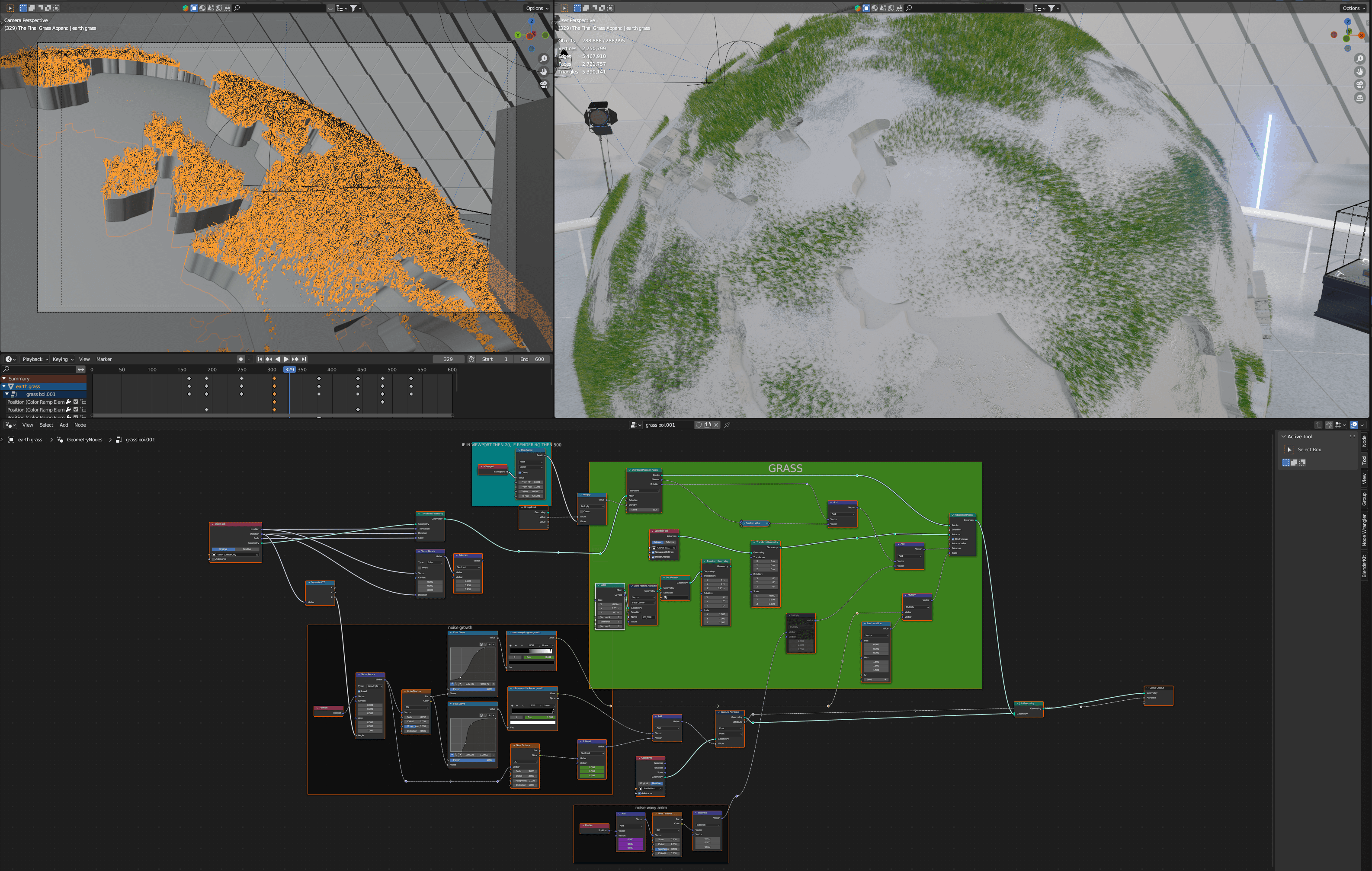 Geometry Nodes, a new node-based workflow had just been introduced into Blender, something very similar to Houdini - used in the most reputable studios. I created a grass system that could be iterated with ease than if using traditional 3D methods.